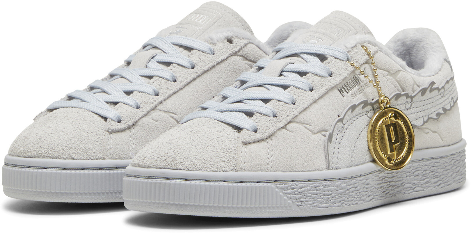 Верх кед выполнен из мягкой меховой замши, обеспечивающей долговечность и стильный внешний вид. Золотая металлическая бирка сбоку подчеркивает эксклюзивность коллекции, а уникальные детали, такие как тисненый логотип PUMA Cat на одной пятке и череп на другой, создают атмосферу приключений.