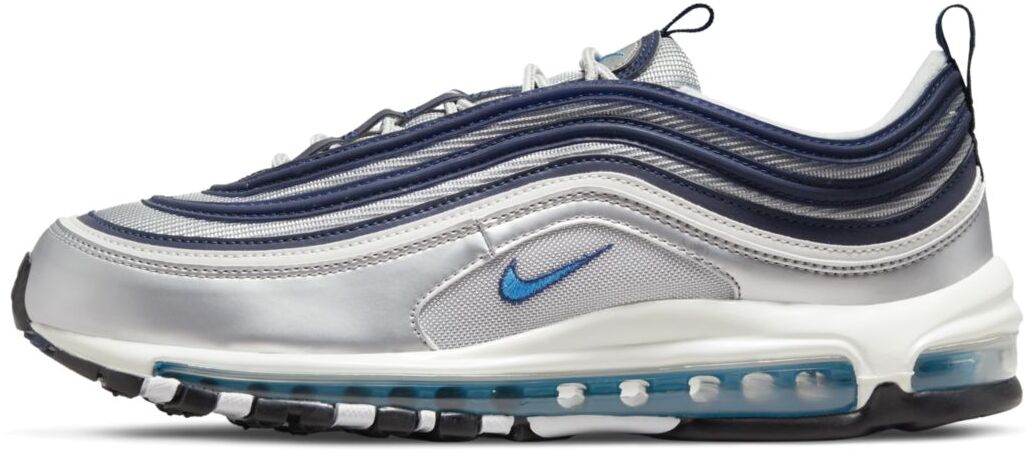 Мужские кроссовки Nike Air Max 97 в крутой цветовой гамме выполнены в духе японских сверхскоростных поездов, а также напоминают капли воды. Кроссовки сверкают как полированные брызговики цвета металлик Chlorine Blue с акцентом на плавные линии покругу. Воздушная сетка обеспечивает прохладу, а амортизация Nike Air во всю длину обеспечивает первоклассный комфорт во время движения.