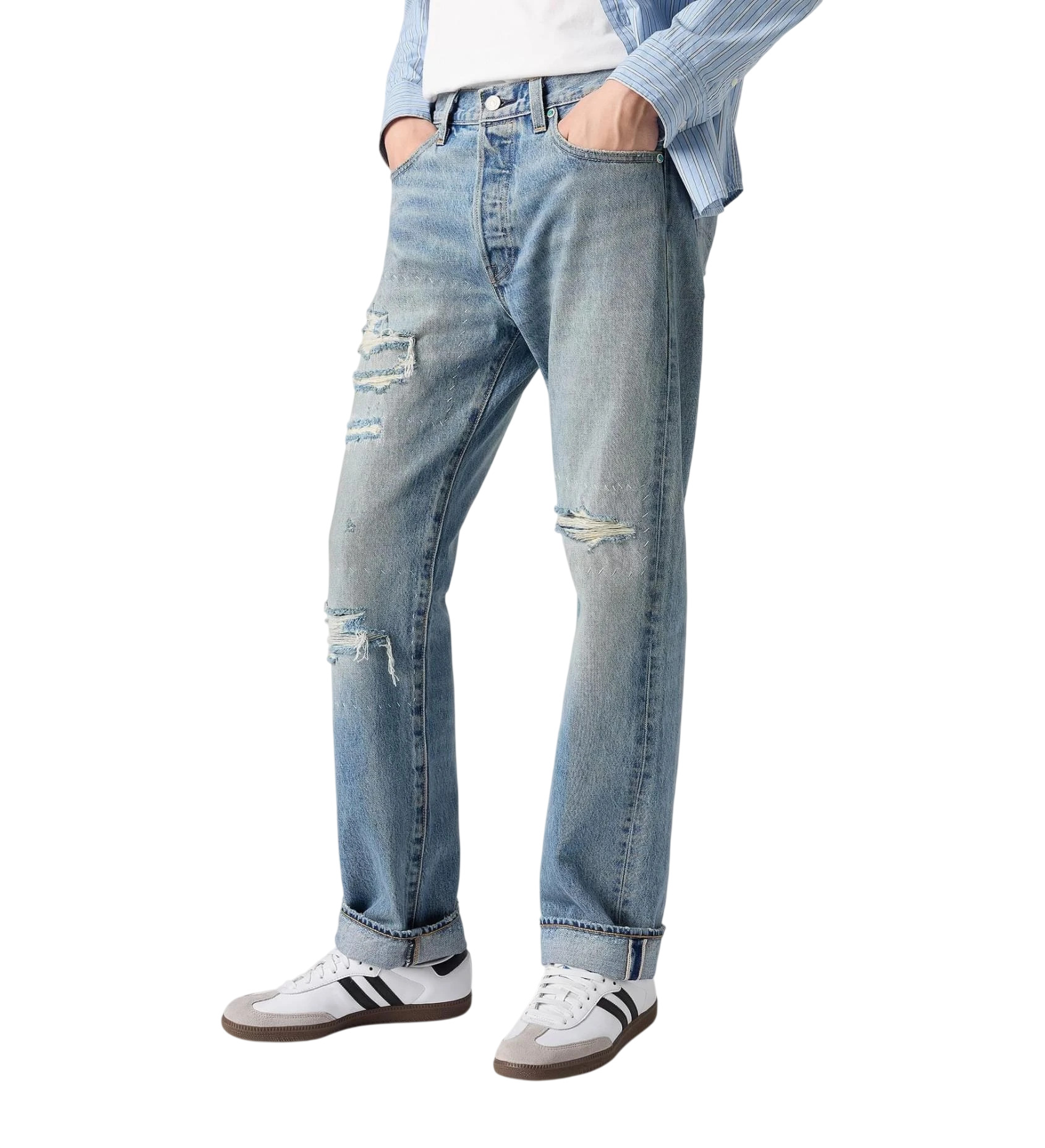 Эти джинсы универсальны в стиле и их можно носить как во всю длину, так и подвернутыми, что позволяет адаптировать их под разные образы и настроения. Особенно эффектно они смотрятся в сочетании с курткой Levis Trucker и простой футболкой с круглым вырезом, создавая классический американский образ, вдохновленный традициями и культурой США.
