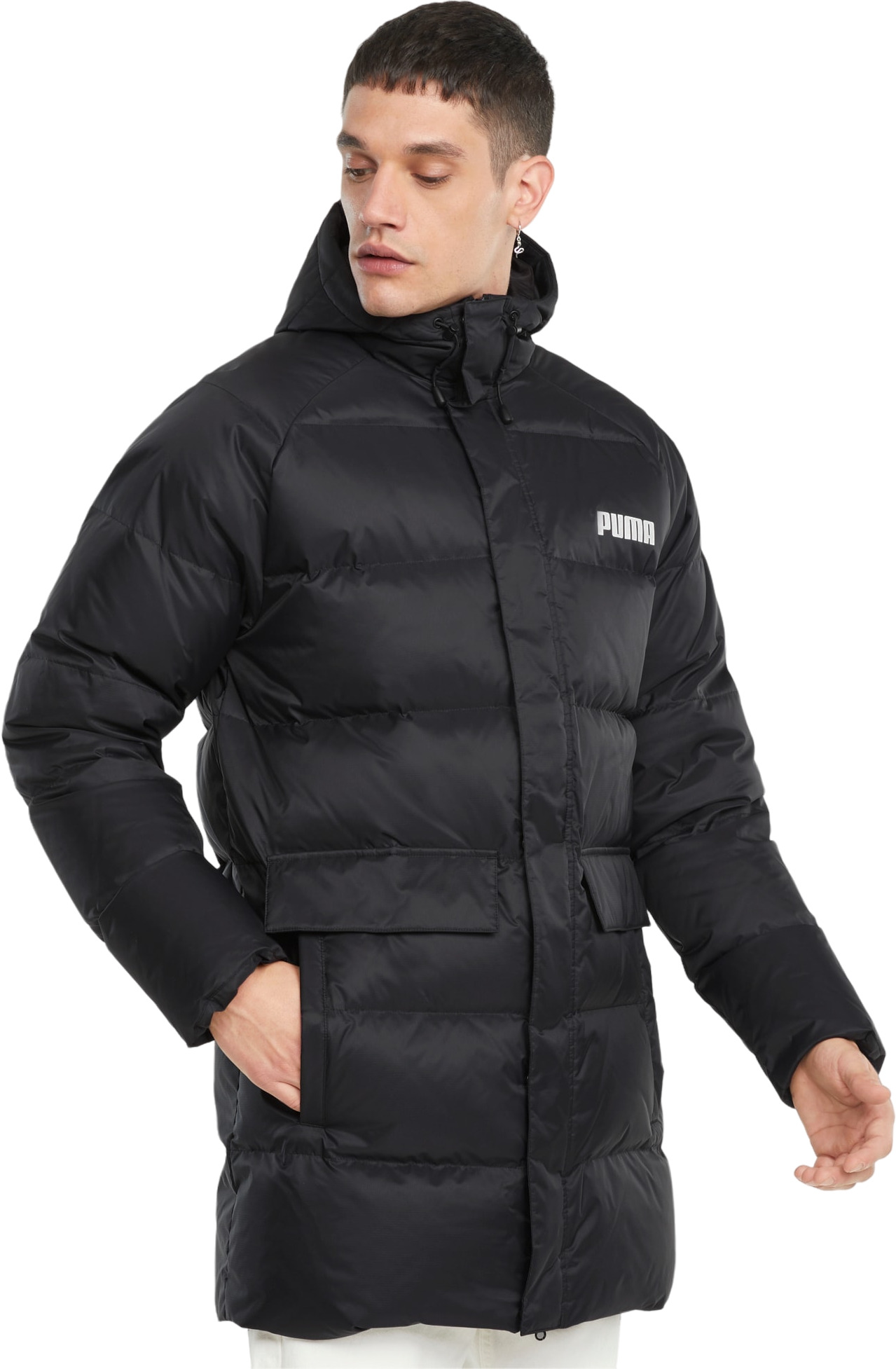Удлиненный и утепленный пуховик декорирован спереди принтом с надписью PUMA, а также тесьмой с фирменной символикой PUMA сзади. Натуральный наполнитель модели изготовлен в полном соответствии со Стандартом ответственного производства пуха (RDS) - это означает, что все гуси и утки, отдавшие свои пух и перья, содержались в гуманных и максимально комфортных условиях. Упругость пуха 480, соотношение утиный пух/перо 80/20, что является показателем наполнителя экстра-класса. Благодаря необходимой термоизоляции по технологии warmCELL "умный" материал изделия удерживает тепло и сохраняет оптимальную температуру вашего тела даже в холодную погоду, а также защищает не только от ветра, но и от влаги. Высокий утепленный ворот с наружным клапаном надежно закрывает шею и объединен с капюшоном, снабженным затягивающимся шнуром. Молния на всю длину изделия открывается с двух сторон. Двойные боковые карманы с молниями и кнопками удобны и вместительны. Благодаря флисовой подкладке боковых карманов ваши