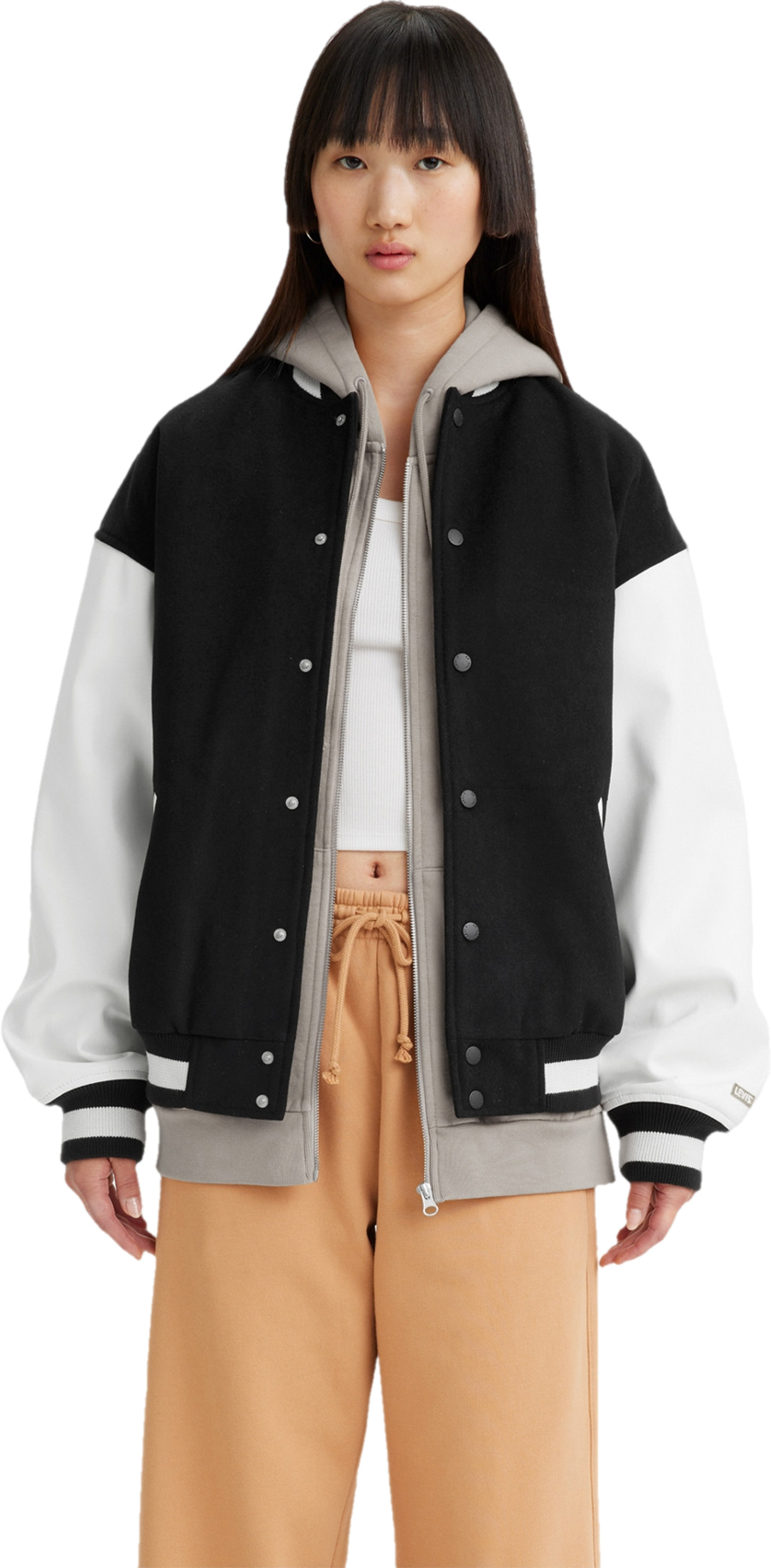 Бомбер для женщины Levis Women Gold Tab 90's Varsity Jacket в университетском стиле, выполненный в черном цвете с белыми рукавами — это современная куртка для создания гламурного образа. Она изготовлен из высококачественных материалов и имеет прочную конструкцию, которая гарантирует долговечность и комфорт при носке. Этот бомбер имеет трикотажную резинку с белой полоской на воротнике, манжетах и нижней части изделия, что придает бомберу спортивный вид. В целом, этот бомбер выглядит очень модно и будет прекрасным дополнением к вашей коллекции верхней одежды.