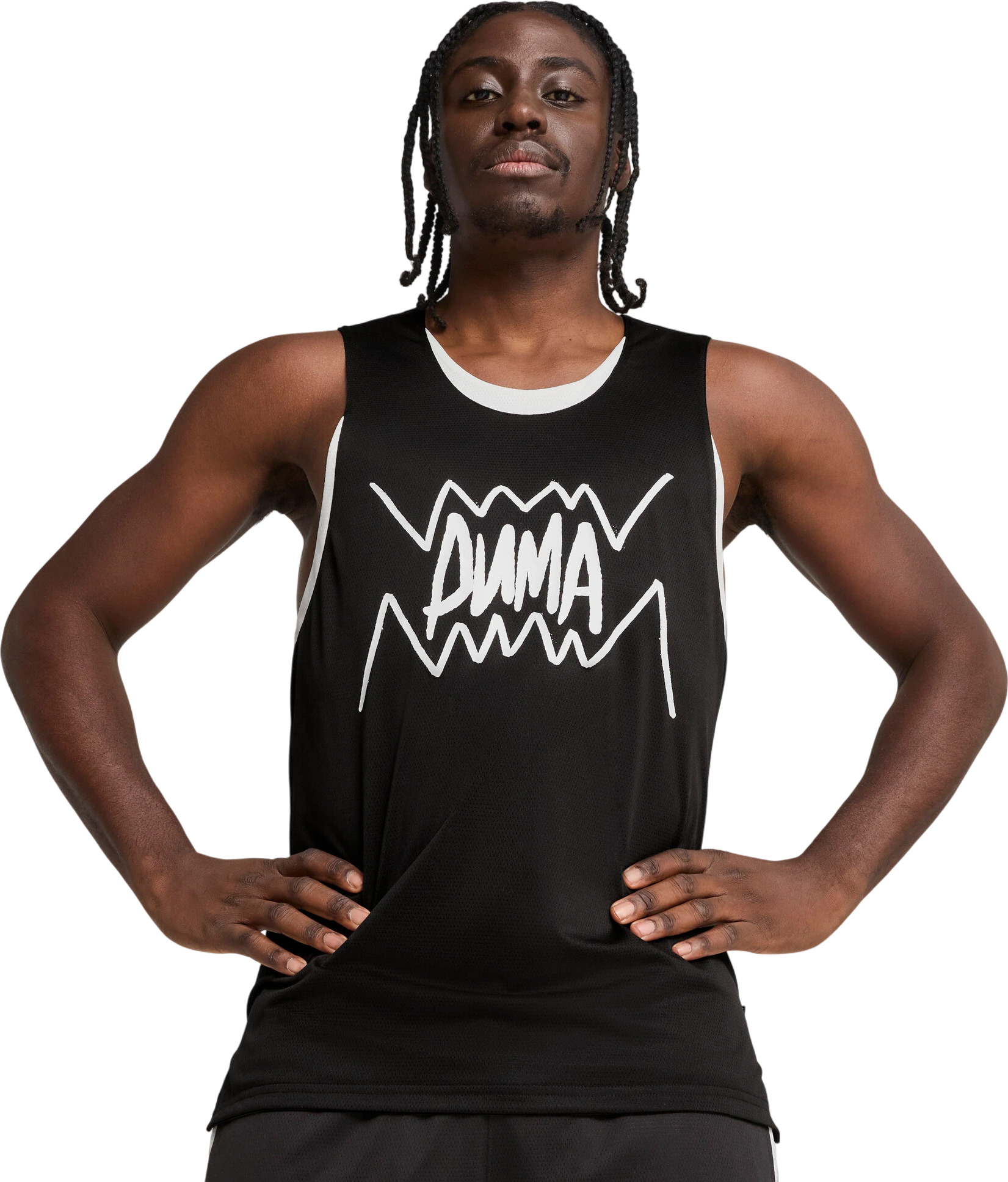 Эта майка стандартного кроя из сетчатого полиэстера украшена оригинальным фирменным оформлением PUMA Hoops. Идеальная модель для интенсивных моментов на площадке и не только.